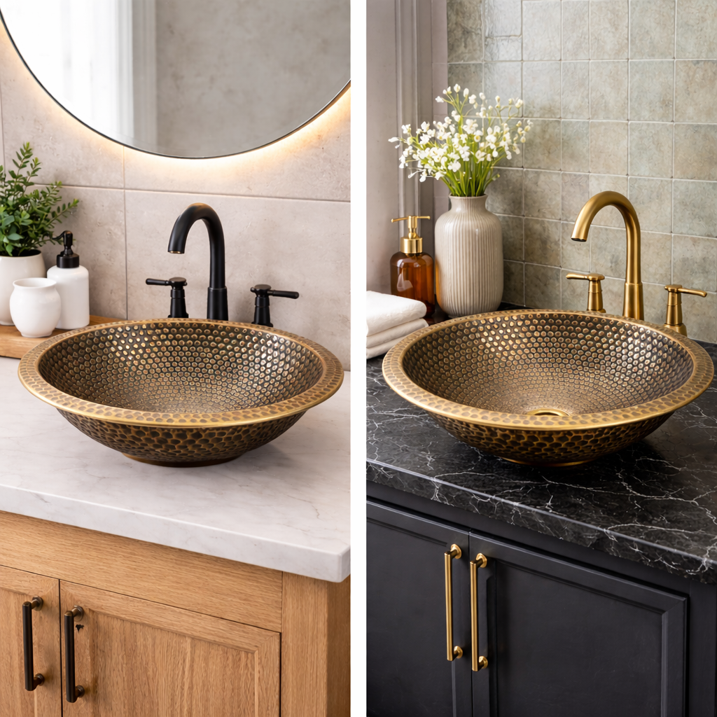 - Handgefertigtes Messing kann leichte Abweichungen in Textur und Farbton aufweisen; dies ist normal und Teil des Handwerks.