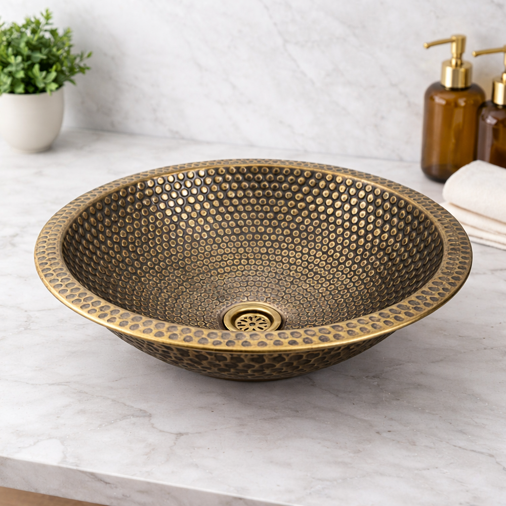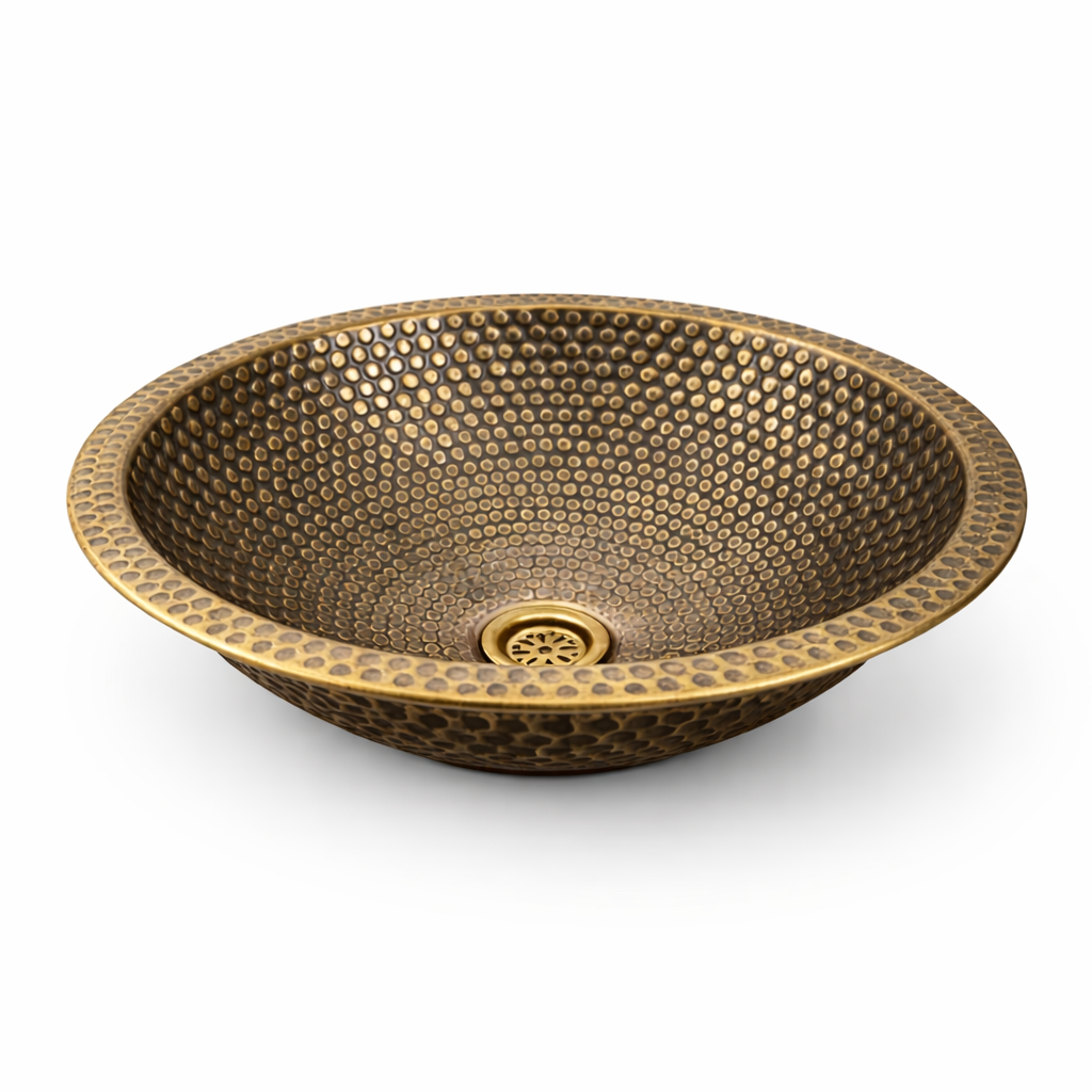 Handgefertigtes marokkanisches Aufsatzwaschbecken aus gehämmertem Messing mit passendem Abfluss – Rund, Antikmessing