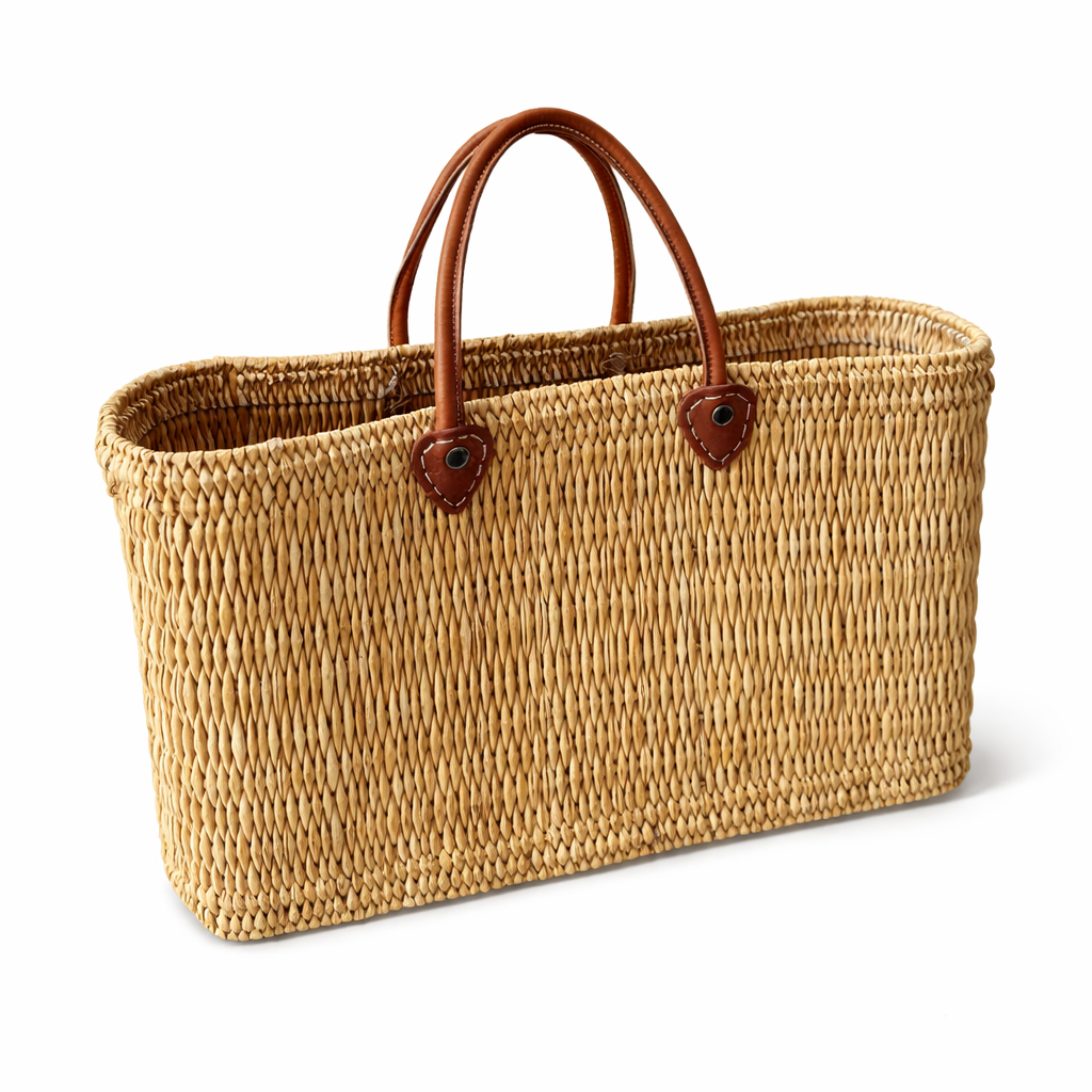 Handgefertigter marokkanischer Marktkorb mit Ledergriffen – Authentische Strandtasche aus Palmblattstroh